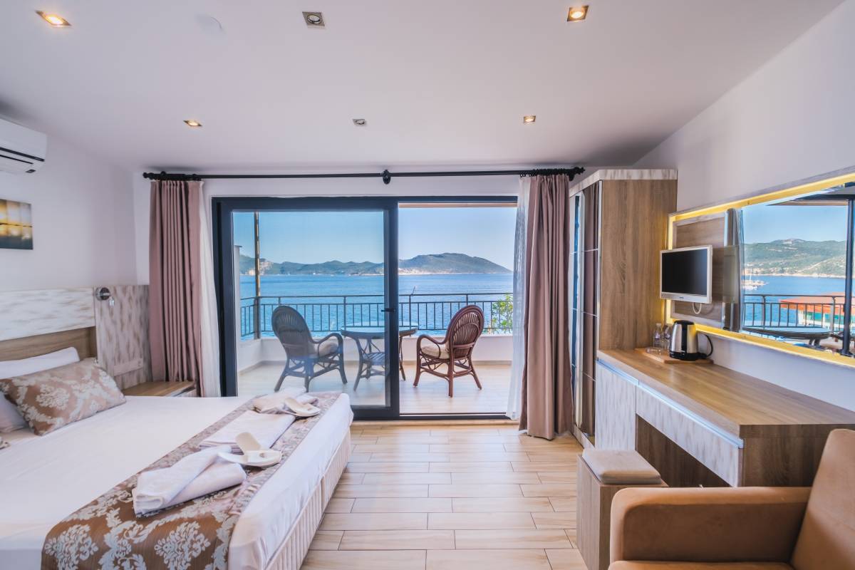 Deluxe – Deniz Manzaralı Double Oda, Kaş’ın büyüleyici Akdeniz manzarasına bakan, modern tasarım ve konforu bir araya getiren özel bir oda tipidir. Ferah yapısı ve şık dekorasyonu sayesinde misafirlerine hem dinlendirici hem de keyifli bir konaklama deneyimi sunar.